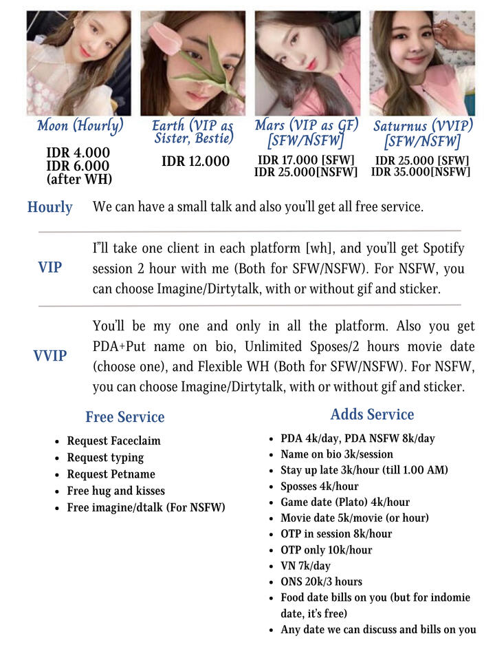 - Untuk NSFW / ONS bisa ditanyakan ketersediaan Tamara terlebih dahulu. Dan Tamara hanya menyediakan untuk imagine/dirtytalk only in Bahasa Indonesia.